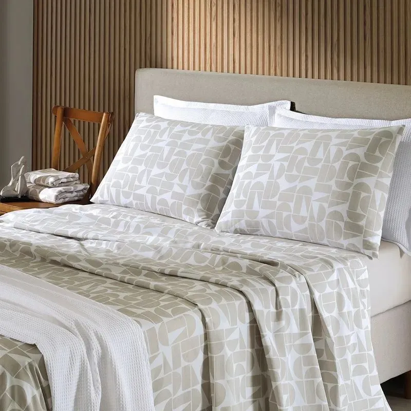 - Jogo com 4 peças sendo um lençol superior, um lençol com elástico e duas fronhas, indicado para camas tamanho padrão casal.