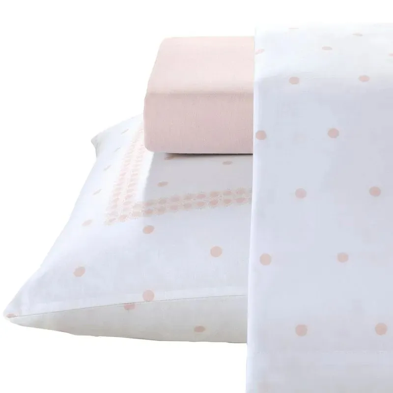 Embalagem composta por: 1 (um) sobre lençol com medidas de 2,20 m X 2,50 m, 1 (um) lençol com medidas de 1,38 m X 1,88 m X 40 cm e 2 (duas) fronhas com medidas de 70 cm X 50 cm.