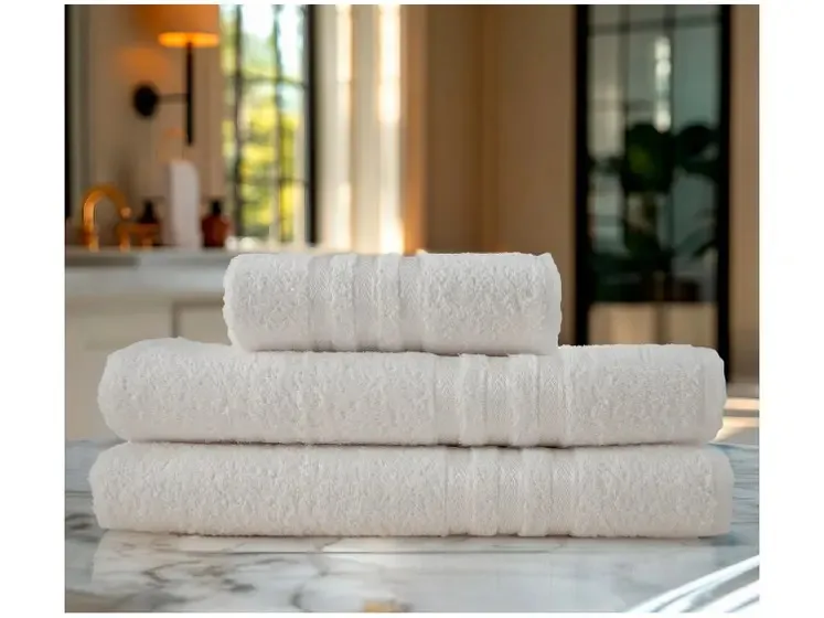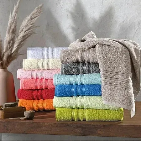 Toalha felpuda em algodão, com detalhes em viscose ou poliéster, macia e absorvente. Banho 70 cm x 1,40 m. Rosto 50 cm x 80 cm